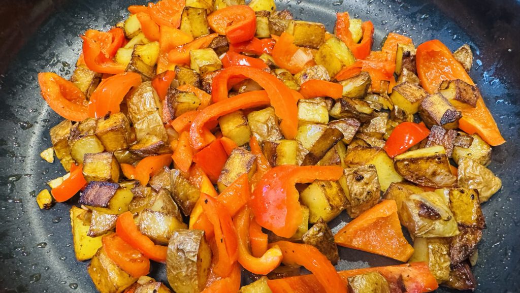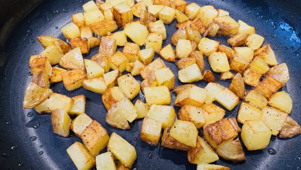 In einer großen Pfanne etwas Öl erhitzen. Zuerst die Kartoffeln bei mittlerer Hitze anbraten (ca. 10–15 Minuten), bis sie leicht gebräunt und fast gar sind.