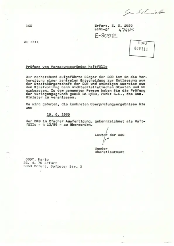 Das Dokument, das wir hier betrachten, stammt vom 3. Juni 1989 und beschreibt eine Anfrage zur Überprüfung von Haftgründen für einen Häftling, in diesem Fall Mario Obst. Der Bericht fordert die zuständige Behörde (BKG – Bezirkspolizei), eine genaue Prüfung durchzuführen, um festzustellen, ob es aus politischen oder anderen Gründen gerechtfertigt ist, dass der Gefangene weiterhin im Strafvollzug verbleiben soll.